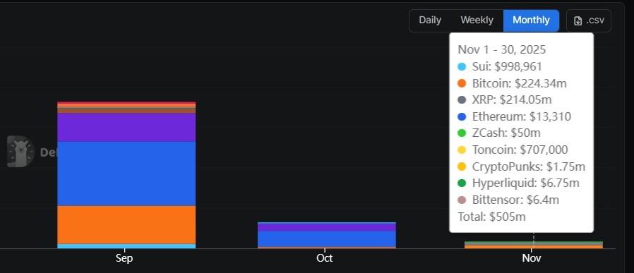 Girişler Kasım ayında daha da azaldı. Pazartesi günü, DAT girişleri bu ay yaklaşık 500 milyon dolara ulaştı ve ekim ayına göre %75'lik bir düşüşe işaret etti.